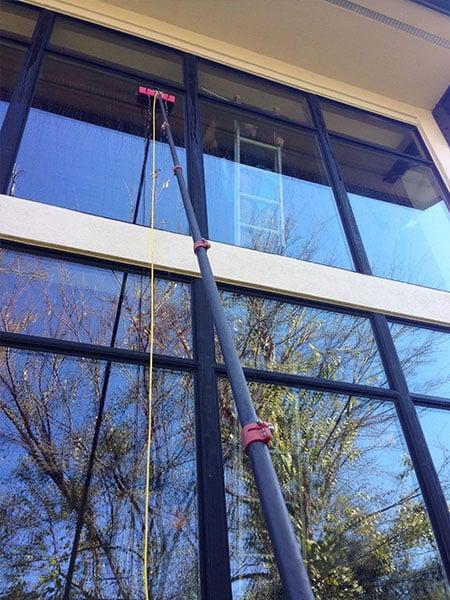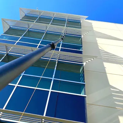 Water-Fed Poles: For low rise buildings, a water-fed pole system is often used. These poles extend from the ground and have a brush at the end that uses purified water to clean the glass, leaving a streak-free finish without the need for a squeegee.
